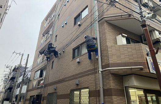 そんな時に「仮設足場を建てずに行うロープアクセス工法(ブランコ工法)」を知ったそうです。そして、その中で色々と面談をした結果、アイケーエーへのご依頼となりました。