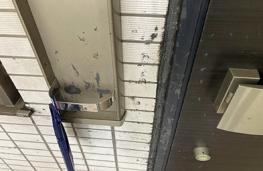 更に、その軟化状態のシーリングを数年に渡り放置しており、小さいお子様のいるご家庭の玄関扉部では、子供が面白がり、ベタベタしているシーリングを触り玄関扉や、周囲のタイルへ付着している状態でした。誤って目や口に入らなかったこと自体が奇跡だったと言える